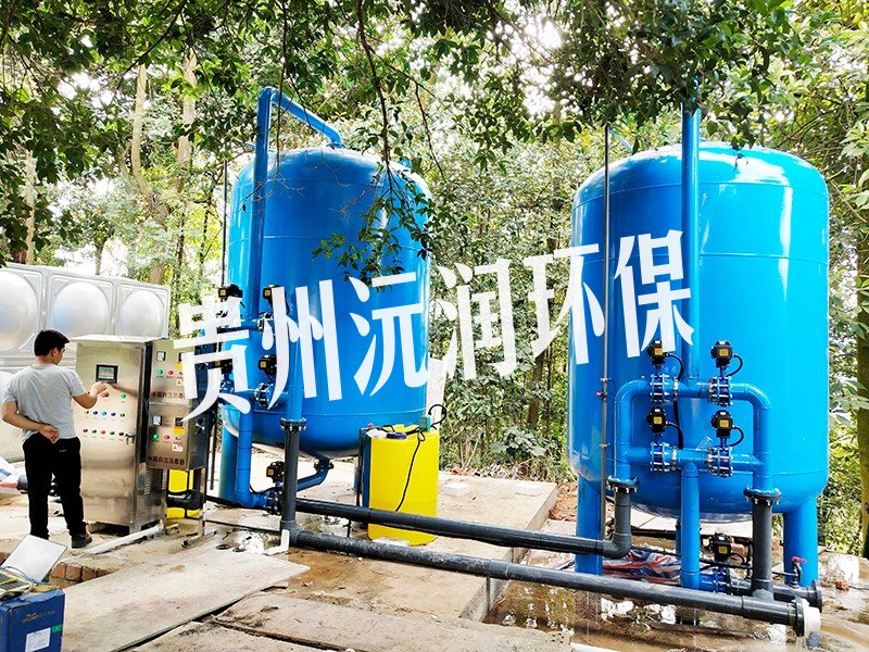 工藝流程:湖水-水箱曝氣消毒-絮凝加藥-石英砂過濾器-活性炭過濾器-精密過濾器-二氧化氯加藥器-凈水池-各用水點